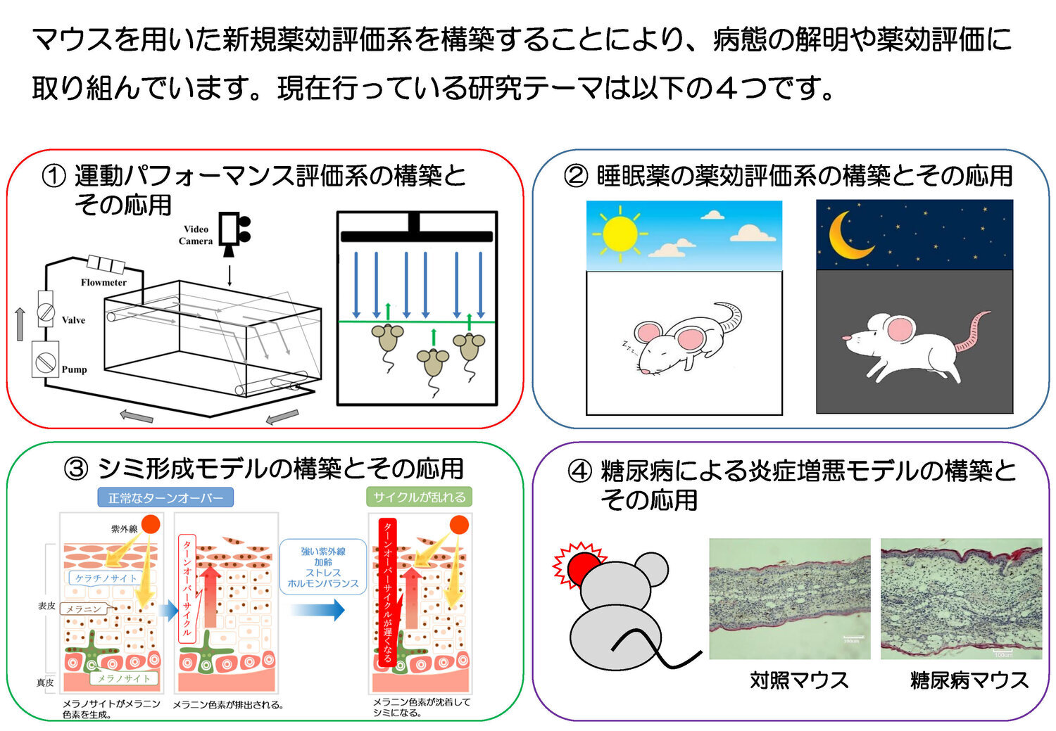 研究テーマ:マウスを用いた新規薬効評価系の構築とその応用 研究分野:薬理学 研究のキーワード:運動パフォーマンス、睡眠、シミ、糖尿病の合併症