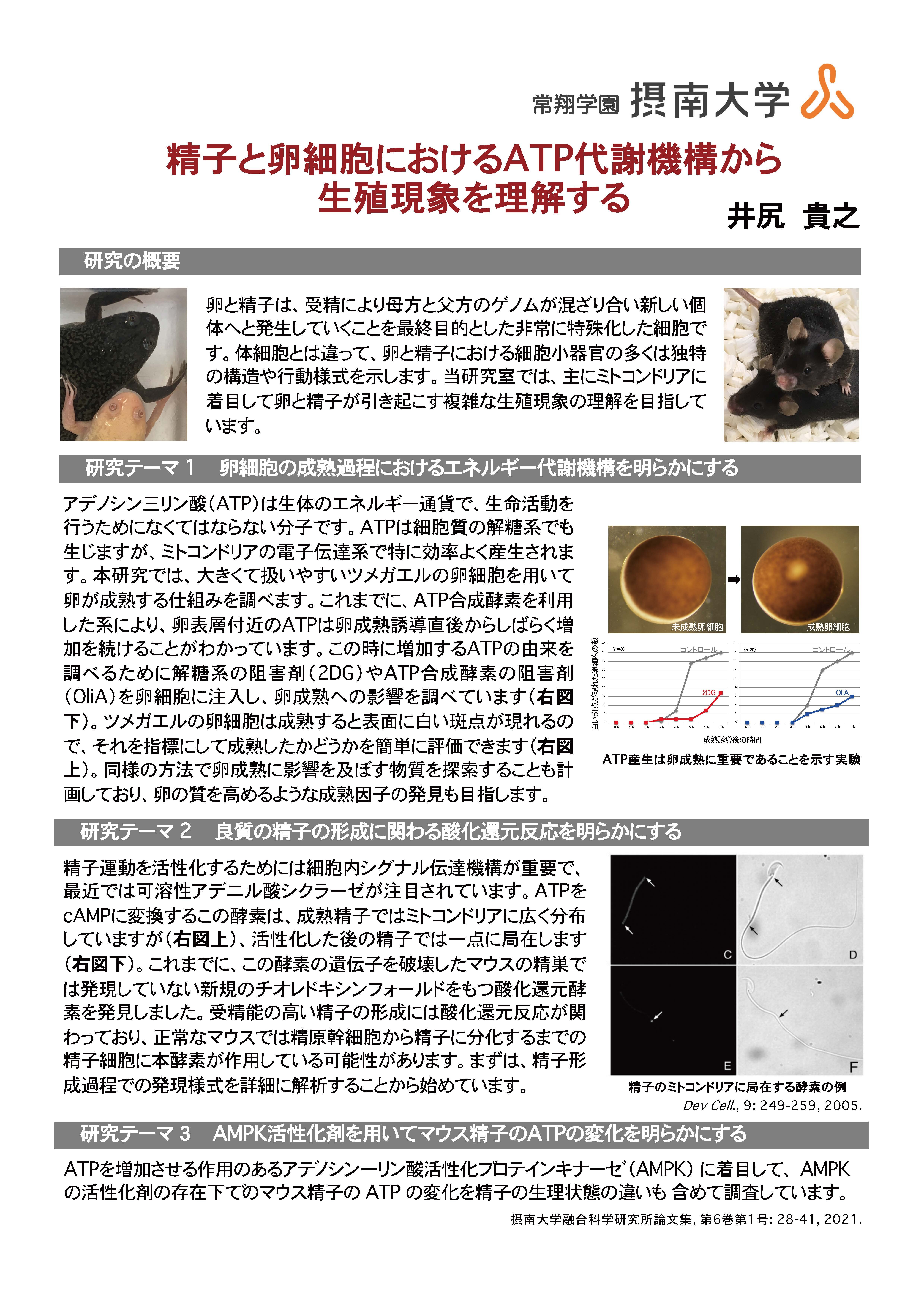 - 井尻貴之, 今村博臣, 岩尾康宏, 横山謙, 佐藤賢一: アフリカツメガエル卵母細胞における全ATP量の測定とATPイメージング. 日本動物学会第84回大会, 岡山, 平成25年9月.