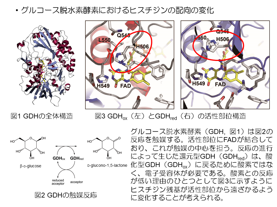 研究内容:タンパク質は,我々ヒトも含む多様な生物を形作る重要な構成成分のひとつです.様々なタンパク質が知られていますが,生命活動においてこれらは,それぞれにひとつ(あるいは複数)の重要な役割を担っています. 一方,どのタンパク質分子も基本的には,直鎖状に連結したアミノ酸の重合体が折畳まれるという共通の構造を持っています.しかしながら,構成するア ミノ酸の種類や順序,折り畳み方が異なることで,タンパク質分子はそれぞれ固有の「形(構造)」を採ります. この「形(構造)」こそが,タンパク質の持つ機能に重要な関わりを持っています. 当研究室では,目で視えない小さいタンパク質の分子構造をX線結晶構造解析で視ることによって,タンパク質の機能がどのようなメカニズムで発揮されるのかを研究しています. このような研究は,薬や臨床診断酵素の開発へとつながります. 最近,ビタミンB2誘導体であるFADを補酵素に持つグルコース脱水素酵素の構造を明らかにしました.本酵素は,糖尿病などの臨床検査やバイオセンサへの応用が期待されています.
