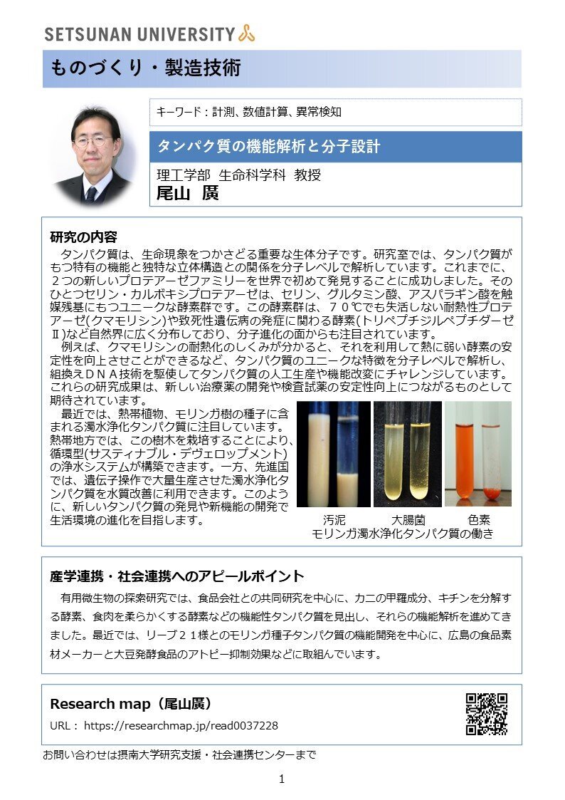 研究内容:タンパク質は、生命現象をつかさどる重要な生体分子です。研究室では、タンパク質がもつ特有の機能と独特な立体構造との関係を分子レベルで解析しています。これまでに、2つの新しいプロテアーゼファミリーを世界で初めて発見しました。グルタミン酸プロテアーゼは、活性部位内にグルタミン酸残基を含む新規なグループであり、それまではペプシンなどが含まれるアスパラギン酸プロテアーゼと考えられていましたが、構造決定により、2004年に第6番目の触媒型のプロテアーゼとして分類されました。このグループは、主に植物およびヒトに影響を与える病原性の真菌に分布しています。これら酵素の生理機能は不明であり、興味が持たれています。セリン・カルボキシプロテアーゼは、セリン、グルタミン酸、アスパラギン酸を触媒残基にもつユニークな酵素群です。この酵素群は、70℃でも失活しない耐熱性プロテアーゼ(クマモリシン)や致死性遺伝病の発症に関わる酵素(トリペプチジルペプチダーゼⅡ)など自然界に広く分布しており、分子進化の面からも注目されています。例えば、クマモリシンの耐熱化のしくみが分かると、それを利用して熱に弱い酵素の安定性を向上させことができるなど、タンパク質のユニークな特徴を分子レベルで解析し、組換えDNA技術を駆使してタンパク質の人工生産や機能改変にチャレンジしています。これらの研究成果は、新しい治療薬の開発や検査試薬の安定性向上につながるものとして期待されています。 最近では、熱帯植物・モリンガ樹の種子に含まれる濁水浄化タンパク質に注目しています。 熱帯地方では、この樹木を栽培することにより、循環型(サスティナブル・デヴェロップメント)の浄水システムが構築できます。一方、先進国では、遺伝子操作で大量生産させた濁水浄化タンパク質を水質改善に利用できます。また、有用微生物のスクリーニングも行っており、キチンを分解する酵素、食肉を柔らかくする酵素、呈味性を改善する酵素などを見出し、それらの機能解析と食品への応用を進めてきました。 このように、私の研究室では、新規なタンパク質の探索研究を軸に、分子レベルでの機能解析と新機能の開発を進めています。