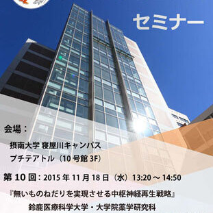 第10回のセミナーでは、鈴鹿医療科学大学大学院薬学研究科の郡山惠樹先生をお招きして、ご講演頂きます。最新の中枢神経再生のお話が伺えると思いますので、ご興味のある方は是非ご参加ください。